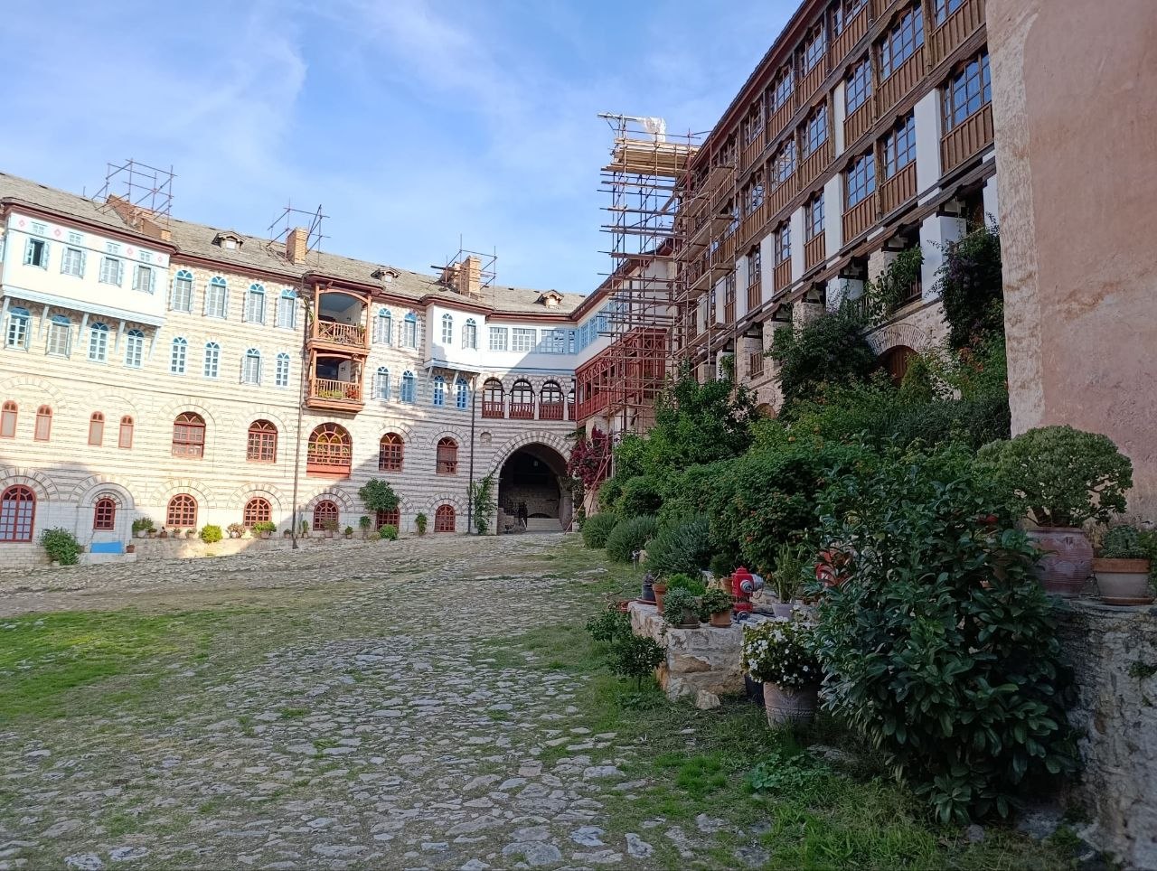 Посматран споља, манастир има изглед средњовековног утврђења, с обзиром да је утврђен бедемима који су високи и до 30 м. Манастир је овако утврђен пошто је у прошлости, као и остала утврђена монашка насеља на Светој гори, морао да се брани од гусара.