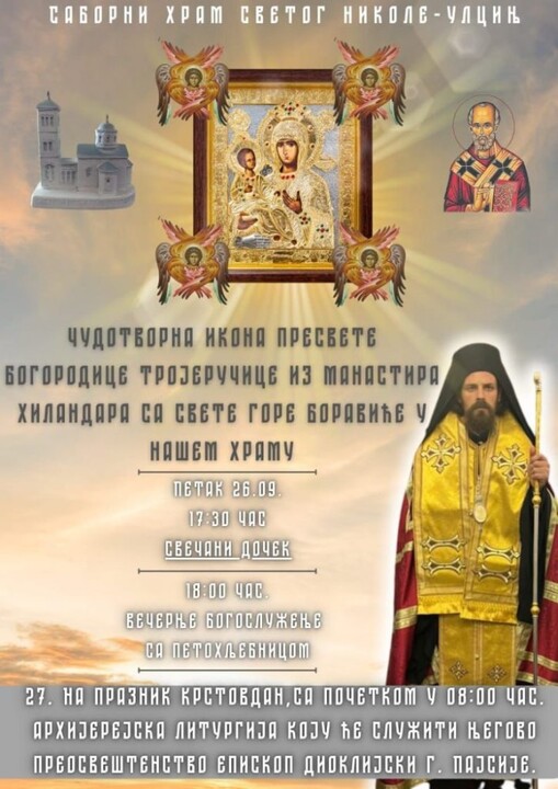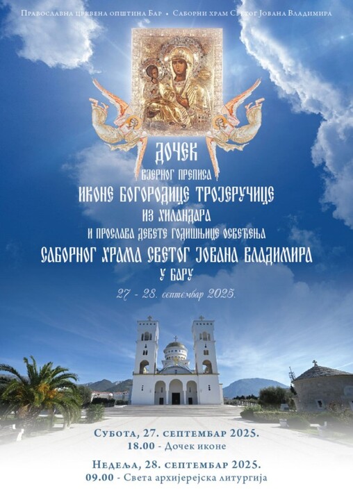 Поводом девете годишњице освећења Саборног храма Светог Јована Владимира, из манастира Хиландара у Бар 27. септембра у 18 часова стиже верни препис иконе Богородице Тројеручице.