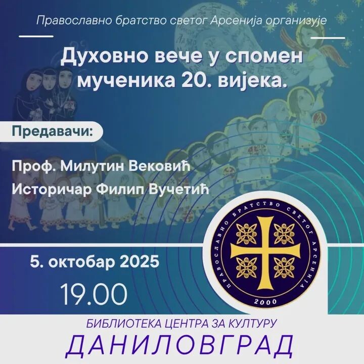Православно братство Светог Арсенија организује „Духовно вече у спомен мученика 20. вијека“.