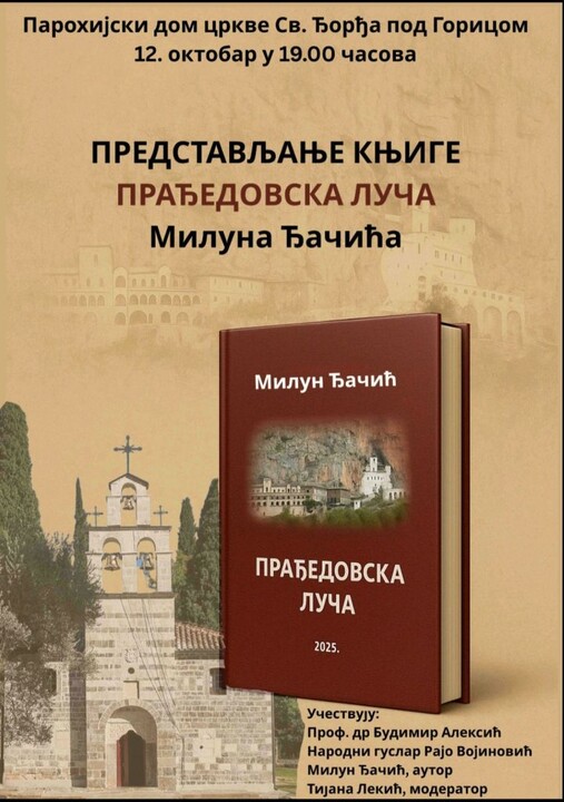 Књига „Прађедовска луча“ Милуна Ђачића, биће представљена читалачкој публици у недељу, 12. октобра, у парохијском дому Цркве Светог Ђорђа под Горицом.