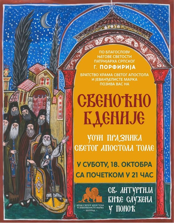 Уочи празника Светог апостола Томе, у храму Светог апостола и еванђелисте Марка у Београду биће служено свеноћно бдење.