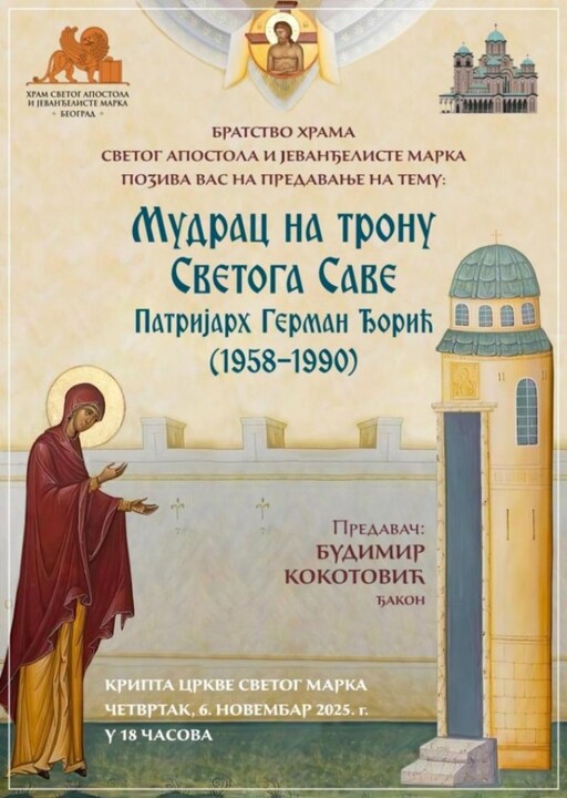 Братство храма Светог Марка у Београду позива вернике на духовно сабрање које ће бити одржано у четвртак, 6. новембра 2025, у крипти храма. Том приликом, ђакон Будимир Кокотовић одржаће предавање под насловом „Мудрац на трону Светога Саве – Патријарх Герман“.