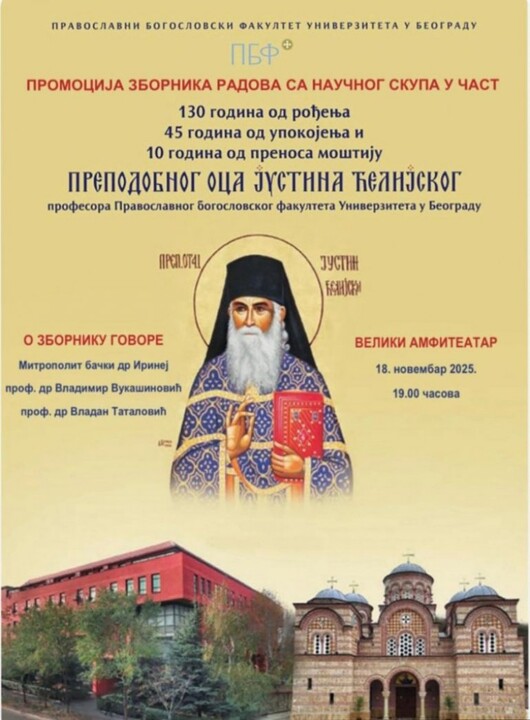 Промоција зборника о Преподобном Јустину Ћелијском организује се на ПБФ-у, уз учешће истакнутих професора и црквених великодостојника.