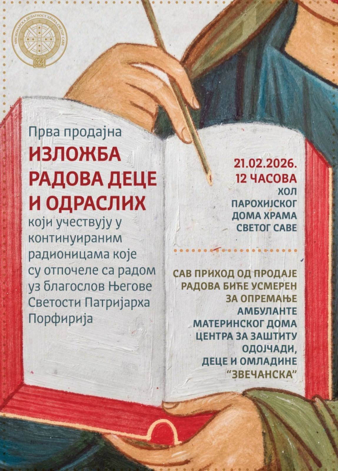 Прва продајна поставка радова деце и одраслих, насталих на радионицама организованим при храму Светог Саве на Врачару, биће отворена у суботу, 21. фебруара 2026. године у 12 часова у холу Парохијског дома.