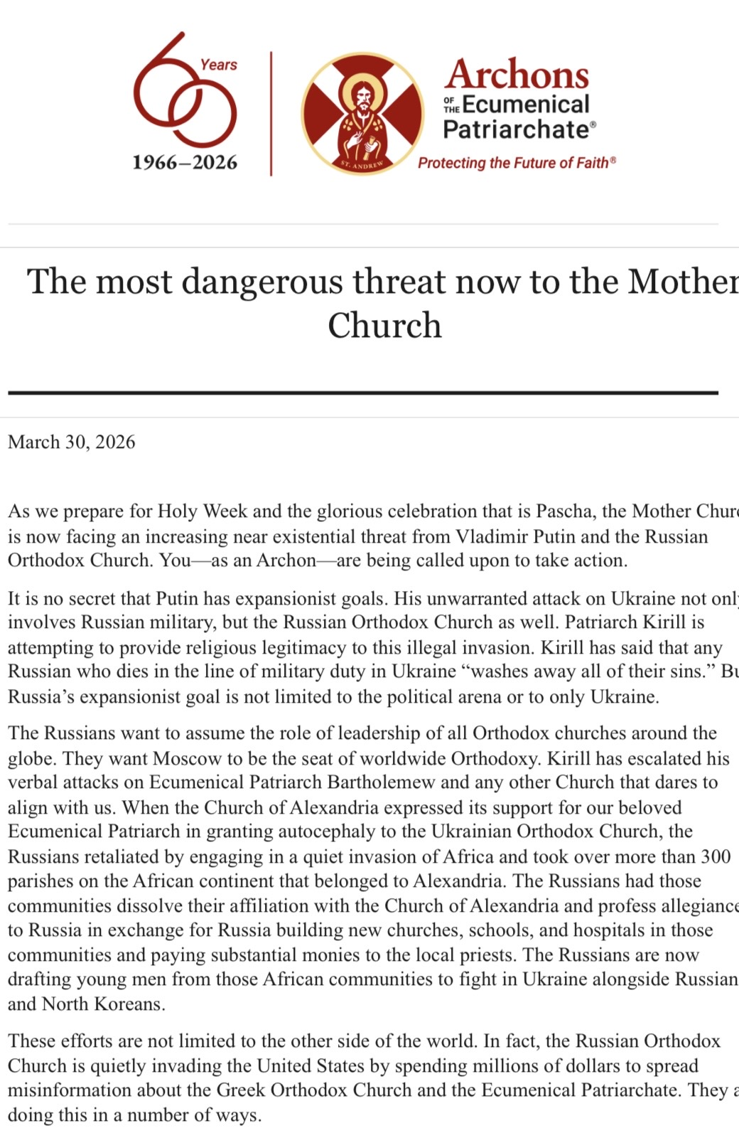 Док се припремамо за Страсну недељу и славну прославу Васкрса, Мајка Црква се сада суочава са све већом готово егзистенцијалном претњом од Владимира Путина и Руске православне цркве. Ви - као Архонт - сте позвани да предузмете акцију.