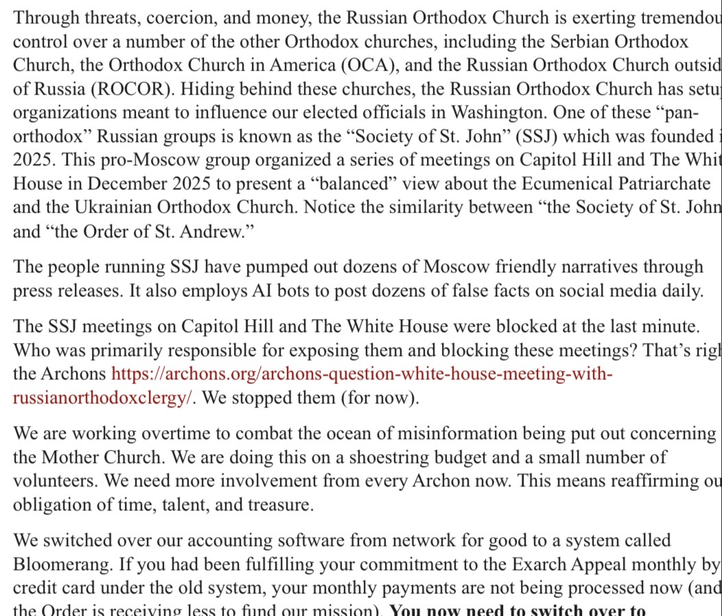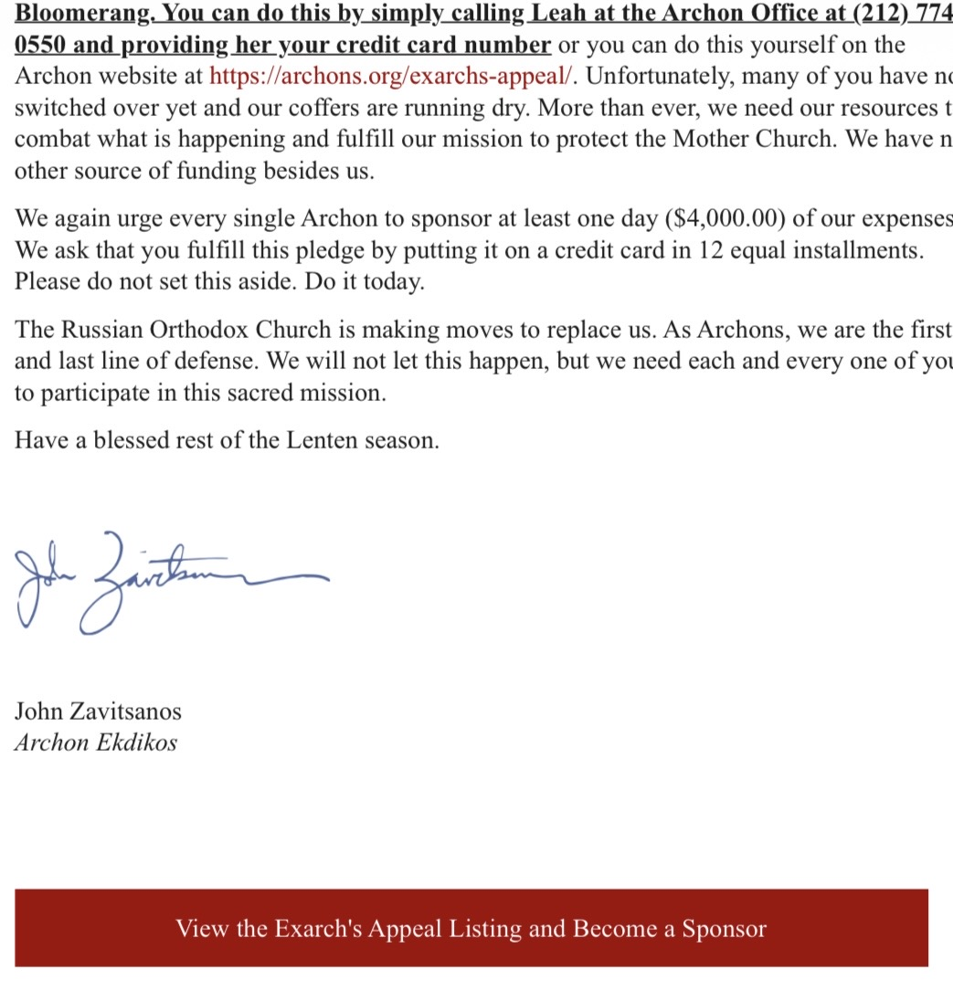 „Радимо прековремено како бисмо се борили против океана дезинформација које се пласирају у вези са Мајком Црквом. Ово радимо са ограниченим буџетом и малим бројем волонтера. Потребно нам је веће учешће сваког Архонта сада. То значи потврђивање наше обавезе времена, талента и новца... Руска православна црква предузима кораке да нас замени. Као Архонти, ми смо прва и последња линија одбране. Нећемо дозволити да се ово деси, али нам је потребно да свако од вас учествује у овој светој мисији.“