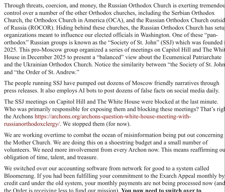 „Људи који воде Друштво Светог Јована су путем саопштења за јавност објавили десетине наратива пријатељских према Москви“, наводи се у имејлу архонта.